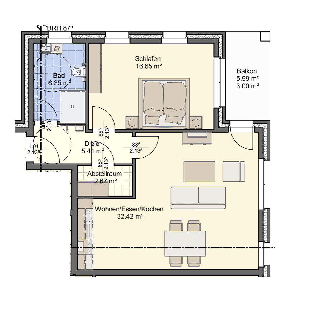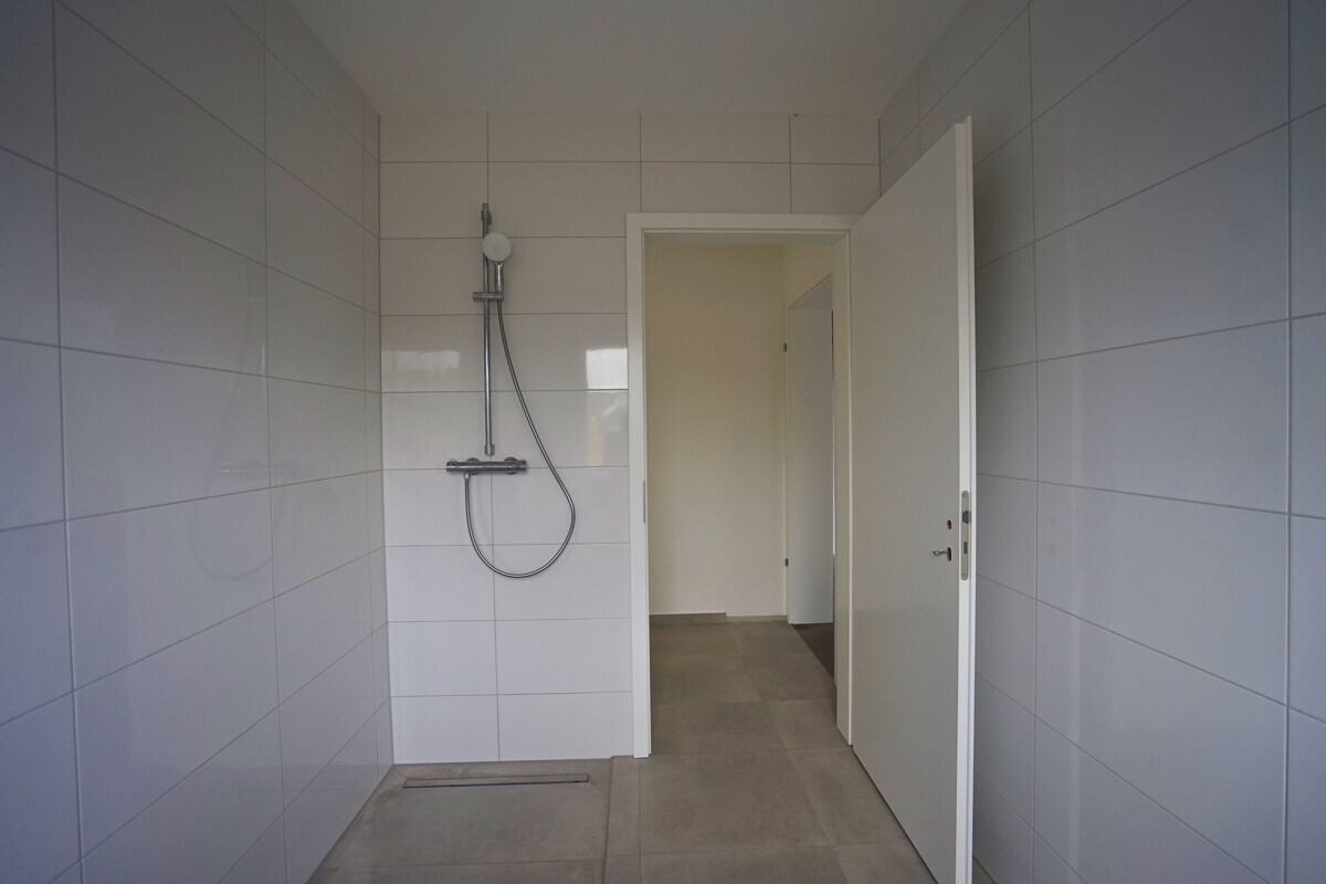 Das separate Schlafzimmer bietet ausreichend Platz für Ruhe und Rückzug. Das Tageslichtbad ist hochwertig ausgestattet und überzeugt mit bodengleicher Dusche, eleganter Sanitärausstattung und zeitloser Fliesengestaltung. Ein praktischer Abstellraum innerhalb der Wohnung rundet das Raumangebot ab.